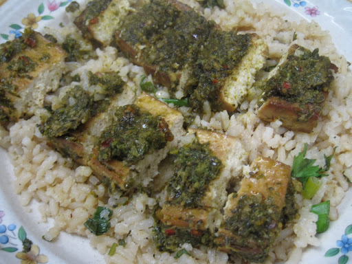 Ever since I got Terry Hope Romero’s new cookbook Viva Vegan! I’ve cooked so many awesome, authentic-tasting vegan Latin recipes. I made the Chimichurri Baked Tofu as per her recipe and served it atop her Cilantro-Lime Rice. I used to think I didn’t really care for cilantro, but this rice sure proves me wrong. It’s so good and refreshing. I didn’t even use fresh limes, so I didn’t have any zest, just lime juice from a bottle, and still, soooo good! Same goes for the chimichurri sauce and the baked tofu, the whole meal is so tasty and summery and easy. And when you bake the sauce with the tofu, it tastes even better than it did raw. And it is darn good raw. This book may have finally turned me on to making sauces. It’s so easy and rewarding — throw everything in the food processor, make the centerpiece to a truly homemade meal.
