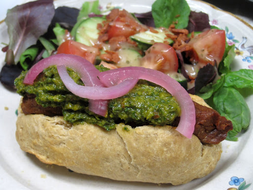 n I want to NYC not too long ago to see some friends of mine, we went to this place that just sold fancy hot dogs, including this hot dog with chimichurri sauce on crusty bread. I really wanted to imitate it! I made Independence Day Wieners and Little Baguettes from the book 500 Vegan Recipes. The recipe for Little Baguettes has you actually make the baguettes bigger than I made them (the recipe makes two of ’em, but I made three), but I knew I wanted them smaller for my purposes. Also from Viva Vegan!, I made Pickled Red Onions, just figuring they’d be good on top. And boy was I right! This really hit the spot. Next time, though, I think I’ll make a different bread. I haven’t really been impress