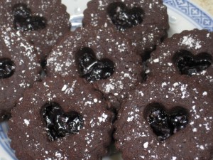 A few weeks ago, I got a cookie press from Home Goods (I love that store!) and I was excited to use it. Too excited to wait until I actually had the chance to get the actual ingredients called for in an actual recipe. But I improvised. I took the recipe for Chocolate Marmalade Sandwich Cookies from the book Vegan Cookies Invade Your Cookie Jar, omitted the orange zest, and used blueberry preserves instead of orange marmalade and made these cute li’l lintzertorte-style cookies. I used hearts cuz I was feeling sentimental.
