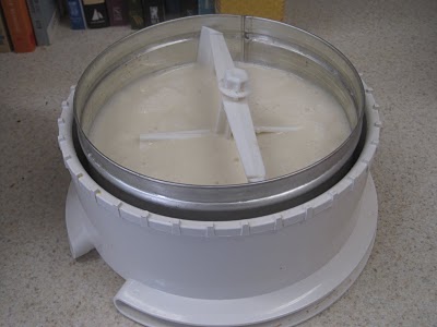 I made the ice cream using basically the recipe from Veganomicon, but the coconut milk I have, for some reason, doesn’t have that thick cream on top, even when it has been stored in the refrigerator, so I added some corn starch to thicken the batter up a bit. Also, I omitted some of the soy milk, replacing it with delicious, delicious caramel syrup. And I added a tablespoon of cinnamon extract. Here it is in the ice cream maker, pre-churning.