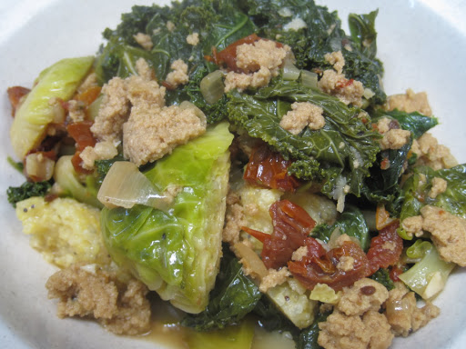 I had gone food shopping before I found out about these dietary restrictions. The plan: Veganomicon‘s Braised Seitan with Brussels Sprouts, Kale, and Sun-dried Tomatoes, along with Poppy Seed Polenta. OK, it doesn’t have onions, but it does have shallots. She didn’t say no shallots! I reduced the amount, though. And the garlic? Well, I cut it in half — 2 cloves instead of 4. She was still pretty freaked out about it though, but I told her that there was NO WAY that she never eats garlic. Garlic is in everything that is tasty, pretty much! Two cloves in the whole recipe was not going to kill her. Also, I didn’t tell her this, but there was garlic in the seitan I’d made as well.
