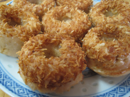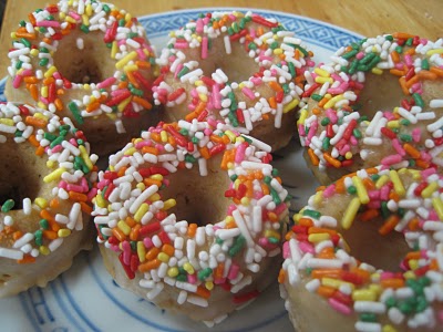 In other news, I finally made Vegan Yum Yum‘s Mini Baked Donuts, which I’ve been talking about making ever since I bought the petite donut pan in Pittsburgh’s Strip District (an amazing place filled with food markets — extensive ethnic markets, veggie stands, and also a renown fish market, which I’ll try to ignore because, more than anything, I’m against the eating of fish — it doesn’t really bother me if people eat chicken or beef of whatever, but eating fish is just environmentally inexcusable). I glazed them all, then dipped half in good, old-fashioned sprinkles,