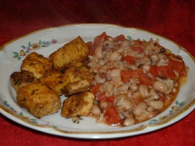 | Rosemary-Roasted Tofu Cubes and Creole Hoppin’-Jean from Bryant Terry’s Vegan Soul Kitchen. Mmmm, I wish I was eating this right now, it’s so good. |