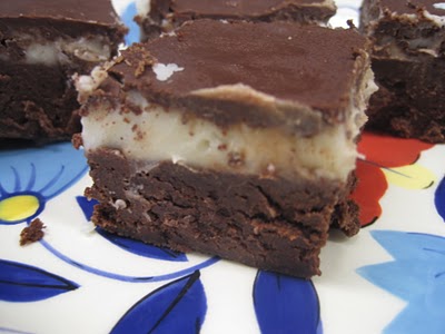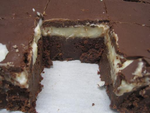 Truth be told, I didn’t really understand what kind of treat I was making until after I made it. The bottom layer is sort-of like a brownie, and sort of like fudge. It’s really dense and rich, with the consistency of fudge, but it contains flour, so it’s not really fudge. It was really difficult to mix the flour into it, too. I actually ended up adding extra non-dairy milk because it was pretty dry. Maybe it was dry because my chocolate chips are mini, so there are more chips in 1 1/4 cup than rightfully ought to be in the recipe. The middle layer is mint icing, not really “creme.” And the top is just chocolate and some shortening melted together, put overtop, and hardened in the ‘fridge.