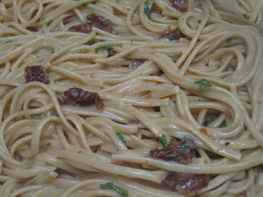 Anyway, after work on Sunday, starving, with virtually no fresh ingredients, I cooked one of my most-cooked recipes: Urban Vegan‘s Fettucine Alfredo. I make this every time I’m hungry and haven’t gone shopping because I always have all the ingredients on hand — Earth Balance, non-dairy milk, nutritional yeast, salt and pepper, and pasta. Dynise Balcavage suggests the addition of herbs of some sort and/or sun-dried tomatoes. I still had cilantro from the Arroz Con Seitan and I’ve always got jarred sun-dried tomatoes in oil, so I added them. Yum!