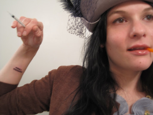 See how tiny the tattoo is?  And see how hilarious I am, holding a syringe with the syringe cap in my mouth?  I kill me!  Yes, it’s true, I’m an old-fashioned diabetic, still using multiple daily injections.  I’ve never had a pump, and I really don’t intend to change anytime soon, although I’d consider it if I were to ever get health insurance or, you know, be lucky enough to marry a Canadian who could help me out with some socialized health care.  Any awesome, smart, good-looking Canadians out there reading this?