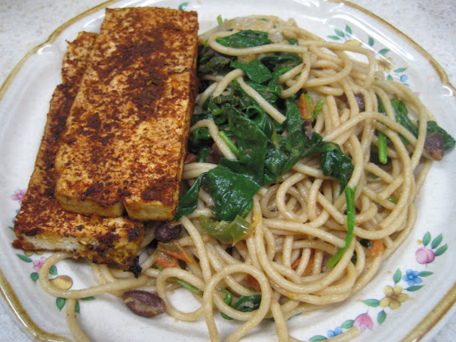 I made Chili-Lime-Rubbed Tofu and Pasta de los Angeles. And, as promised by bloggers everywhere and as you would expect from Ms. Moscowitz, they were easy to make, flavorful, and filling. Really, I cannot complain. I didn’t change much except that I cooked the tofu longer than she says because I always do that. Here’s a delightful picture:
