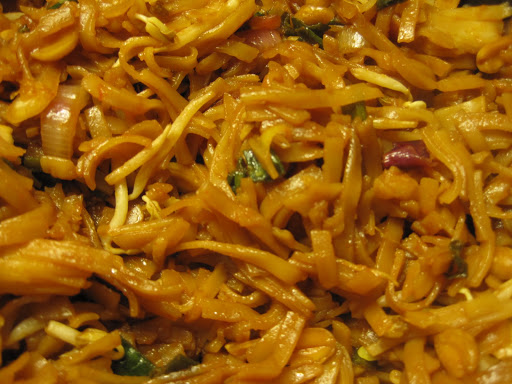 So, yeah, Kristin’s birthday. I doubled the recipe for Brooklyn Pad Thai in Vegan with a Vengeance to feed a crowd. Also because the package of rice noodles just had twice as much as what was needed for the recipe, and I didn’t feel like messing with trying to take out half the noodles that are so interwoven. Isa says that you have to do the recipe in batches, but I find that one whole recipe can be done at once if you use a big, giant pan with edges. Because I had doubled the recipe, I still did it in two batches, but she would’ve had me do it in four. I’m such a lazy bum, what can I say? But it worked out really well and fed the army. Rushing to get to the party, I didn’t take pictures in my relatively well-lit apartment and instead took it in Kristin’s beautifully decorated but dark kitchen. So suffer with me as you look at this picture.