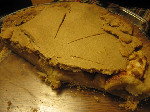 Kristin had told me she prefers pie to cake, and I still had extra apples, so I decided to try my hand at apple pie. That’s right, I’d never made pie. Oh, I’ve made quiches, I’ve made gallettes, I’ve made crisps, I’ve made grunts — but never an actual pie. And, really, I don’t think I could have failed more! I used the crust and pie recipe from The Joy of Vegan Baking, and my understanding is that the trick to making pie is to find a crust recipe you can work with. Colleen Patrick-Goudreau’s is not the one for me. I couldn’t roll it out, and I made the bottom too thick and couldn’t make a suitable crust top. It came up short — literally. It was pretty unpretty. Well, see for yourself.