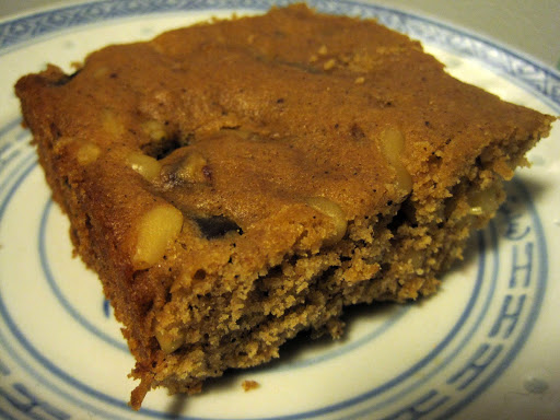The Maple Pine Nut Bars are an interesting creature.  Authors Celine Steen and Joni Marie Newman call them “bars,” but it really isn’t a recipe for a bar.  It’s cake.  Definitely cake.  I’d call it a coffee cake, and certainly, a lot of vegan coffee cake recipes do, like this one, call for soy yogurt.  It’s a good, sophisticated coffee cake.  The dates and pine nuts certainly do make me feel all growed up.  I could see my aunts enjoying this cake a lot.  I don’t know why I pick my aunts over any other type of person who is a generation older than I am, but I’m sticking with it.  For some reason, I really imagine that any of my aunts would greatly enjoy this maple, cinnamon, nutmeg, date, and pine nut treat.  Maybe because they drink coffee?  I don’t know.  This is good, though, especially with coffee, and if I were one of those awesome, artistic food bloggers who was smart enough to plan, the following picture would probably have some coffee next to it, or maybe, like, some coffee beans artfully scattered.  Too bad, though!  You’re at my blog, you just get coffee cake on a plate.